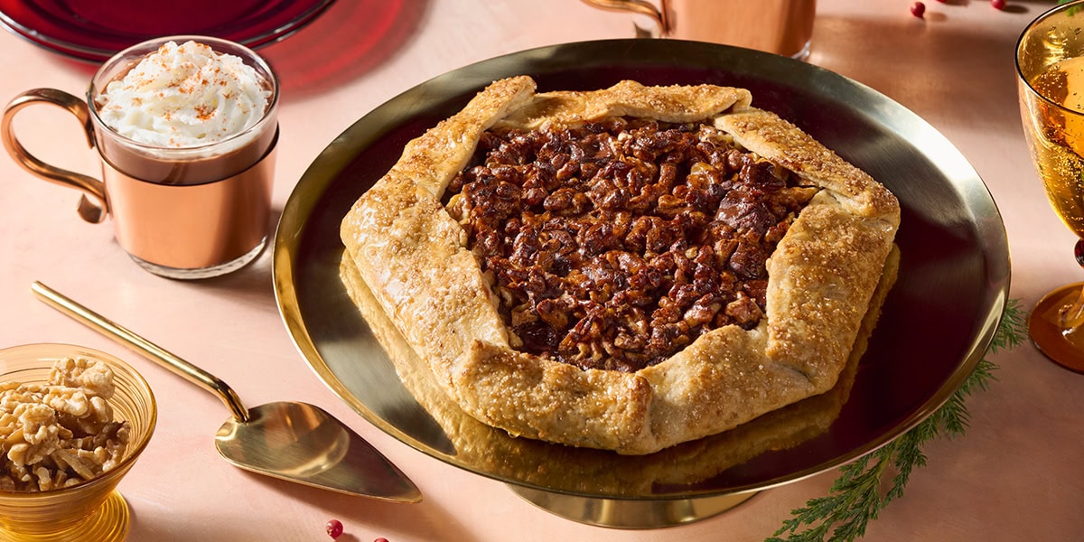 This Mexican Hot Chocolate Galette is a festive twist on a classic dessert. A rich dark chocolate and crunchy walnut filling bakes in a buttery walnut crust, spiced with warm, Mexican-inspired flavors, perfect for holiday gatherings or as a show-stopping gift.