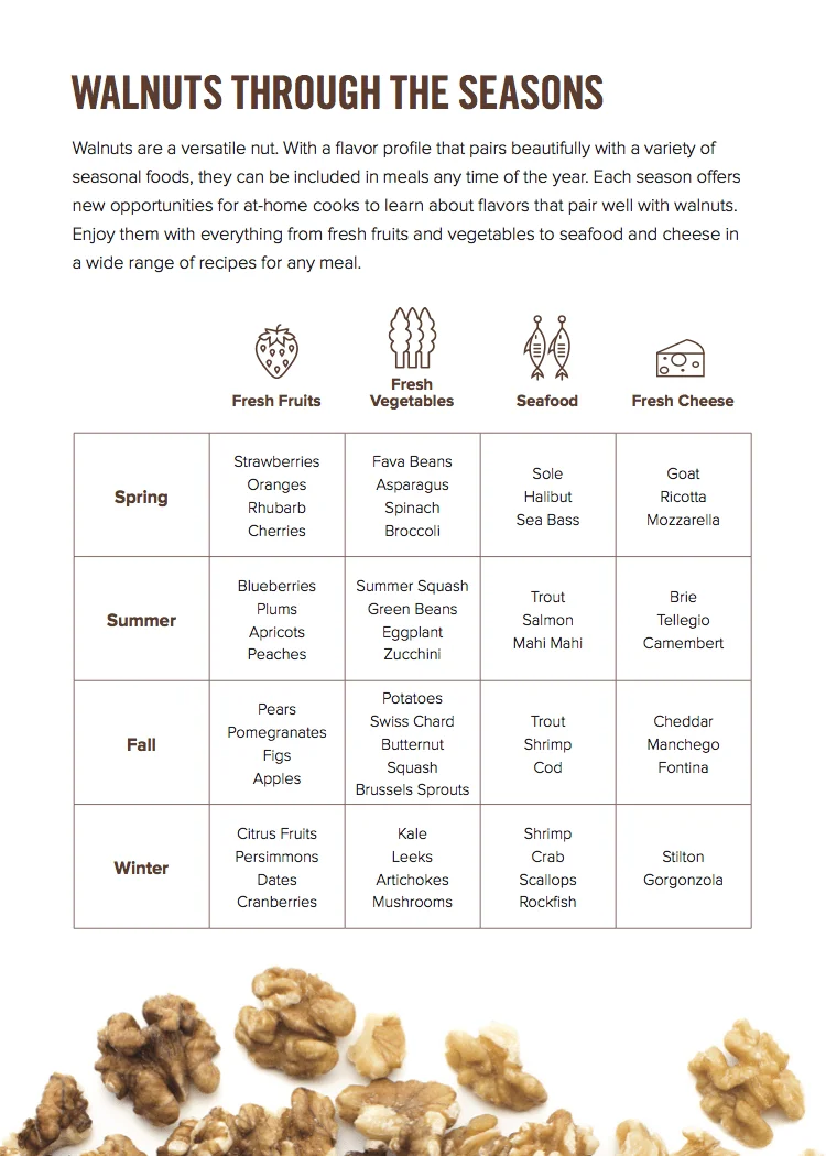 Walnuts are a versatile nut with a flavor profile that pairs beautifully with a variety of seasonal foods. They can be included in meals throughout the year, with each season offering opportunities for home cooks to experiment with new ways to use walnuts. Add crunch to salads and side dishes, boost the nutrient content of desserts and snack bars or enjoy walnuts at the center of the plate with seafood or as a plant-based crumble in tacos, casseroles and more.Ā