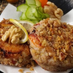 A crunchy crust of chopped walnuts and bread crumbs provides contrasting texture to these light crab cakes.