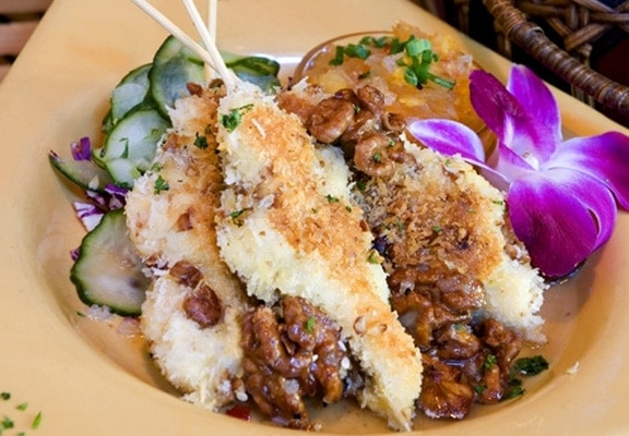 To prepare the chicken breasts, cut them into strips about 2 inches long and 1 inch wide; you should have 30–32 strips, more or less. Set aside. In a food processor, chop the walnuts quite finely; they should be about the same texture as the panko, or slightly larger. In a pie pan or a large plate, stir the walnuts, panko and salt together. Crack the eggs into a bowl, beat until completely blended, then pour into another pie pan or shallow bowl. Preheat the oven to 450ºF. Line a large shallow baking pan with parchment paper, or line with foil and coat with nonstick cooking spray. Remove the skewers from the water.